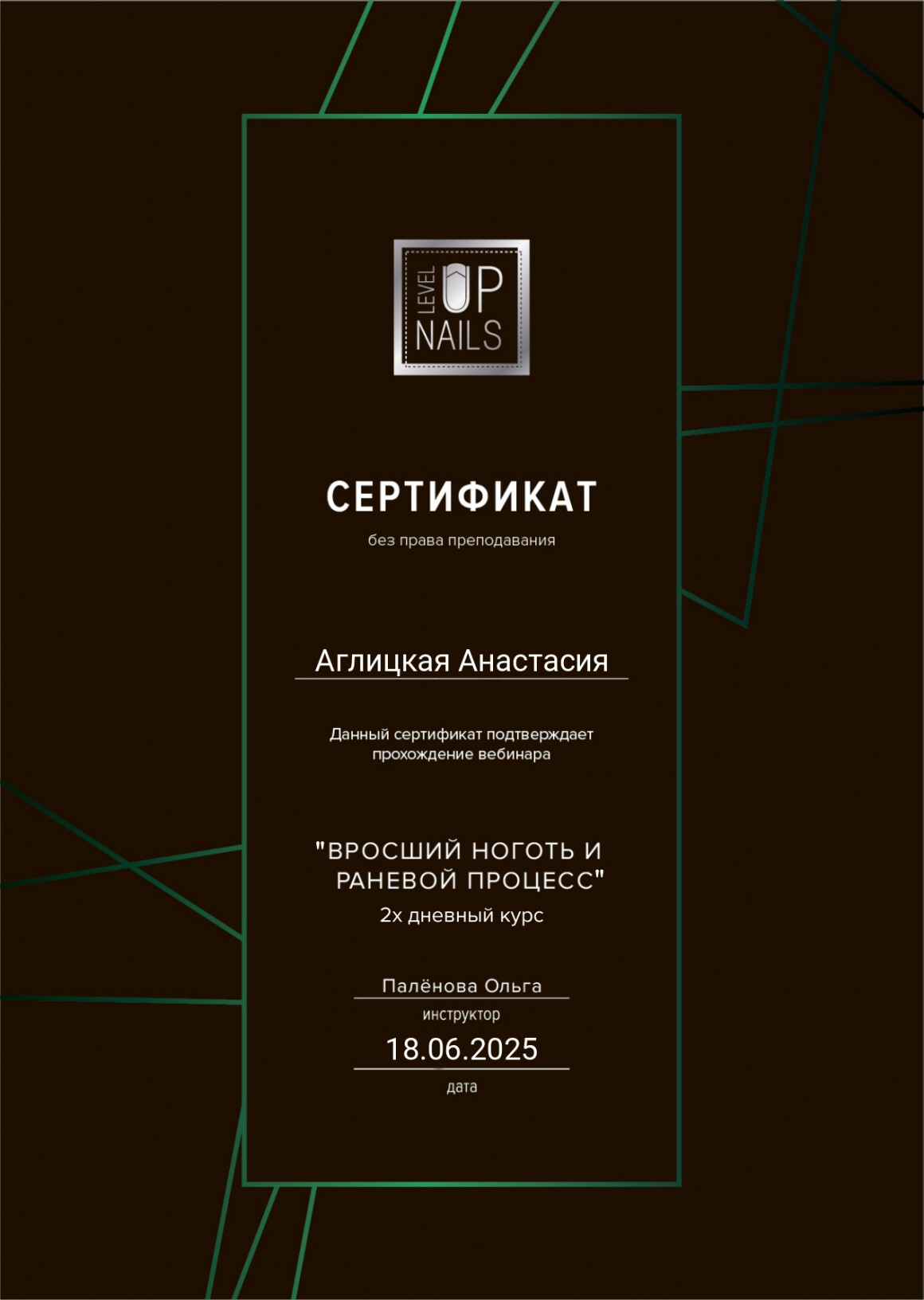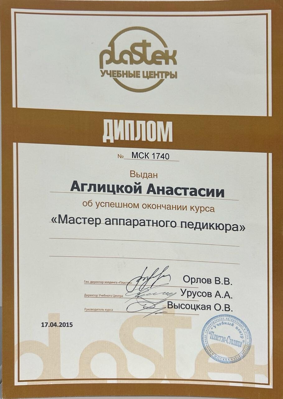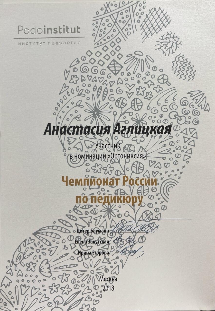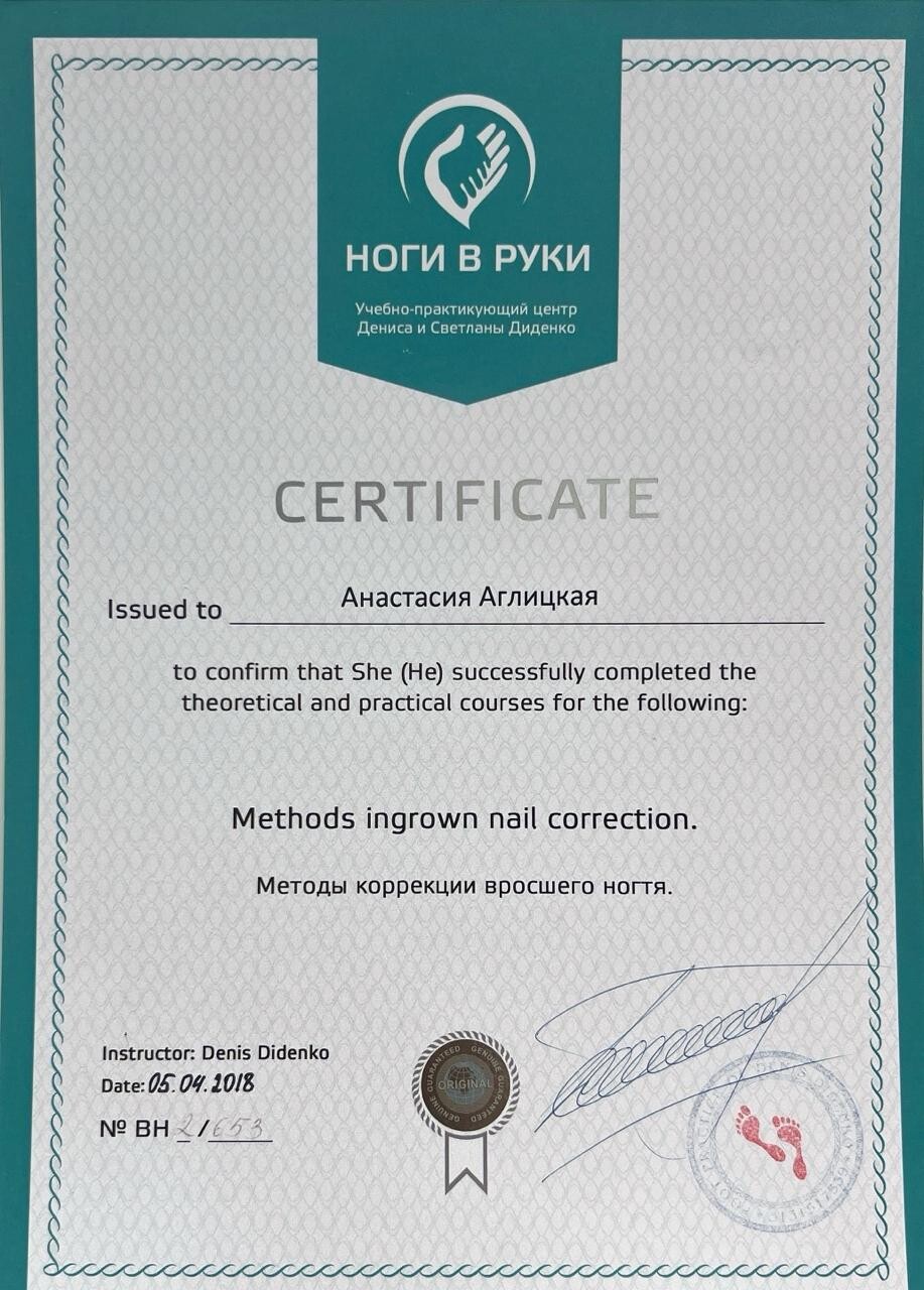 Моя специализация — лечение самых сложных проблем: вросшие и деформированные ногти, грибковые поражения ногтевых пластин, трещины, мозоли. Я использую современные коррекционные системы ORA 3TO, Фрезера, Титановую нить и Unibrace, чтобы вернуть вашим стопам здоровье и эстетичный внешний вид.